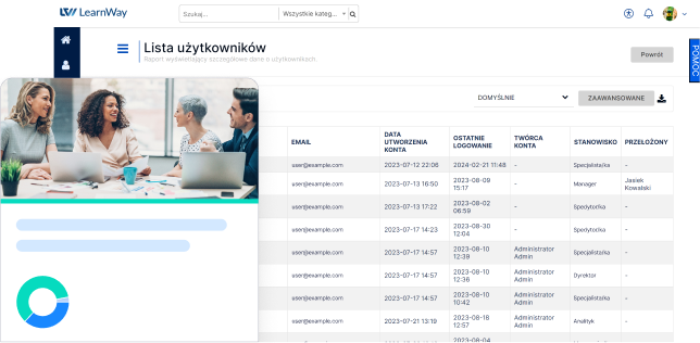 - Struktura organizacji: Przydzielaj użytkowników do grup i zapisuj na szkolenia według określonych kryteriów.