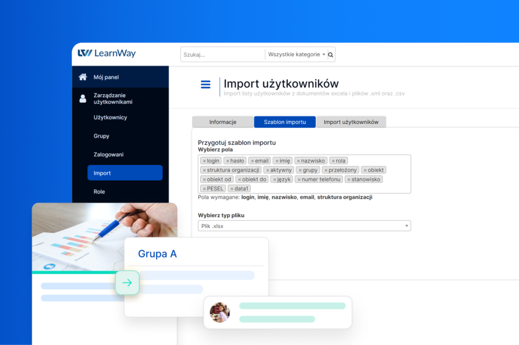- Import użytkowników: Szybko wprowadź dane użytkowników na platformę.
