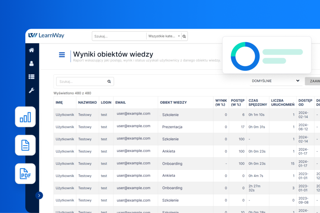 - Szczegółowe raporty: Śledź postępy użytkowników i analizuj efektywność szkoleń.