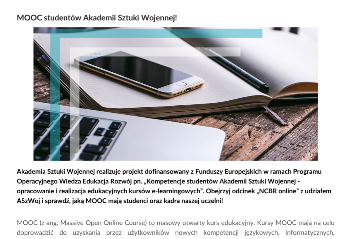 W ramach współpracy z Akademią Sztuki Wojennej, Uniwersytetem Technologiczno-Humanistycznym w Radomiu oraz Powszechną Wyższą Szkołą Humanistyczną „Pomerania” opracowaliśmy razem z wykładowcami treści merytoryczne obejmujące pełne kursy przedmiotowe dla studentów. Zaprojektowaliśmy layouty graficzne kursów tak, aby były przyjazne dla użytkowników.
